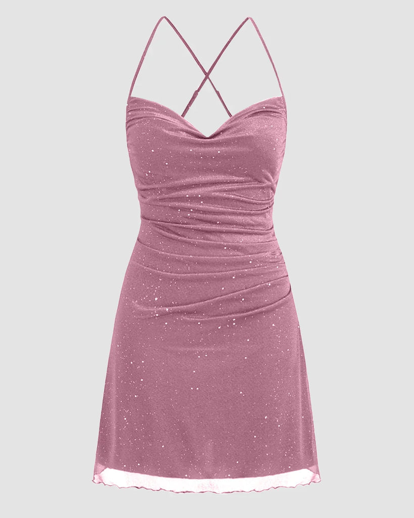 Mesh Cowl Neck Sequin Ruched Mini Dress in Pink
