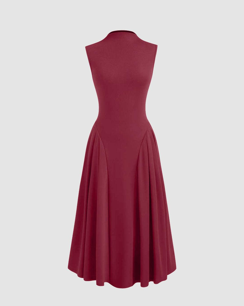 High Neck Solid Ruffle Midi Dress