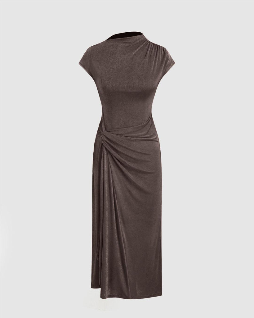 High Neck Solid Twist Ruched Split Maxi Dress In Coco Brown