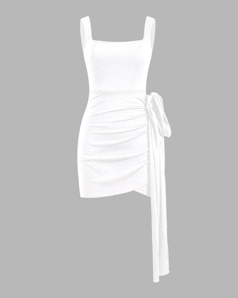 Knotted Tie Ruched Square Neck Sleeveless White Mini Dress
