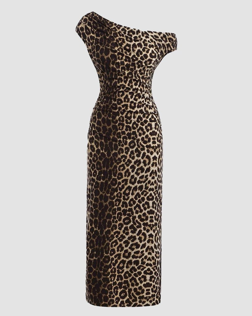 Leopard Print Asymmetrical Shoulder Ruched Waist A-Line Dress