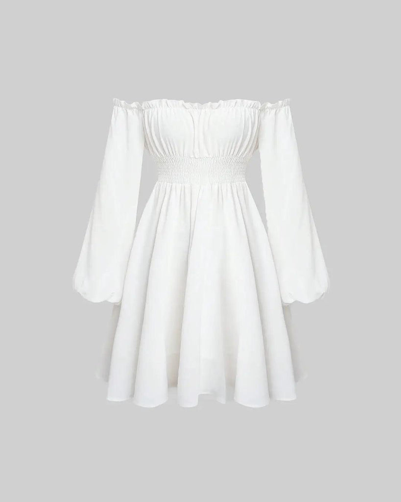 Off Shoulder Lantern Sleeve Frill Trim Dress In White