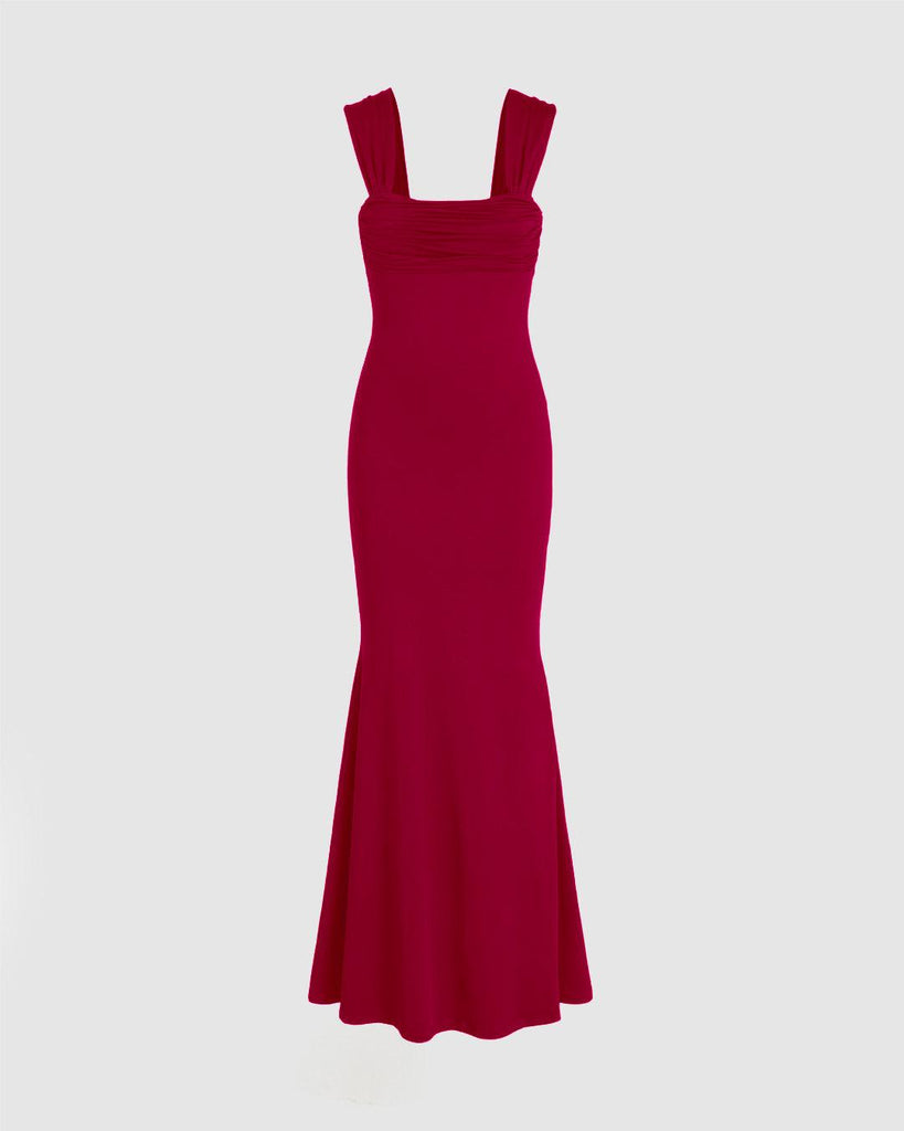 Solid Ruched Square Neckline Ruffle Maxi Dress